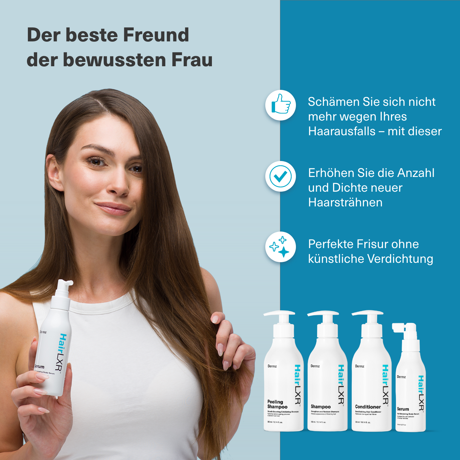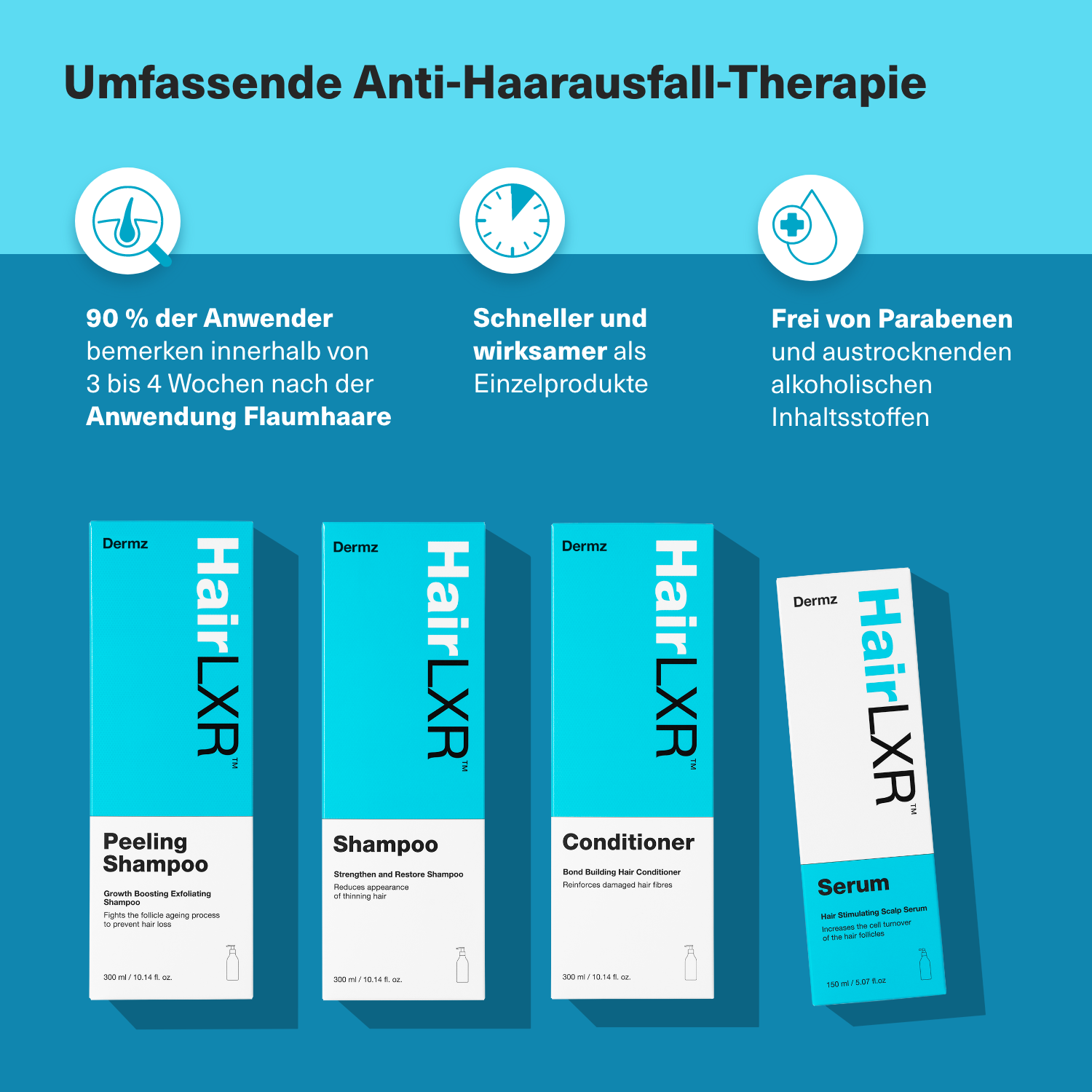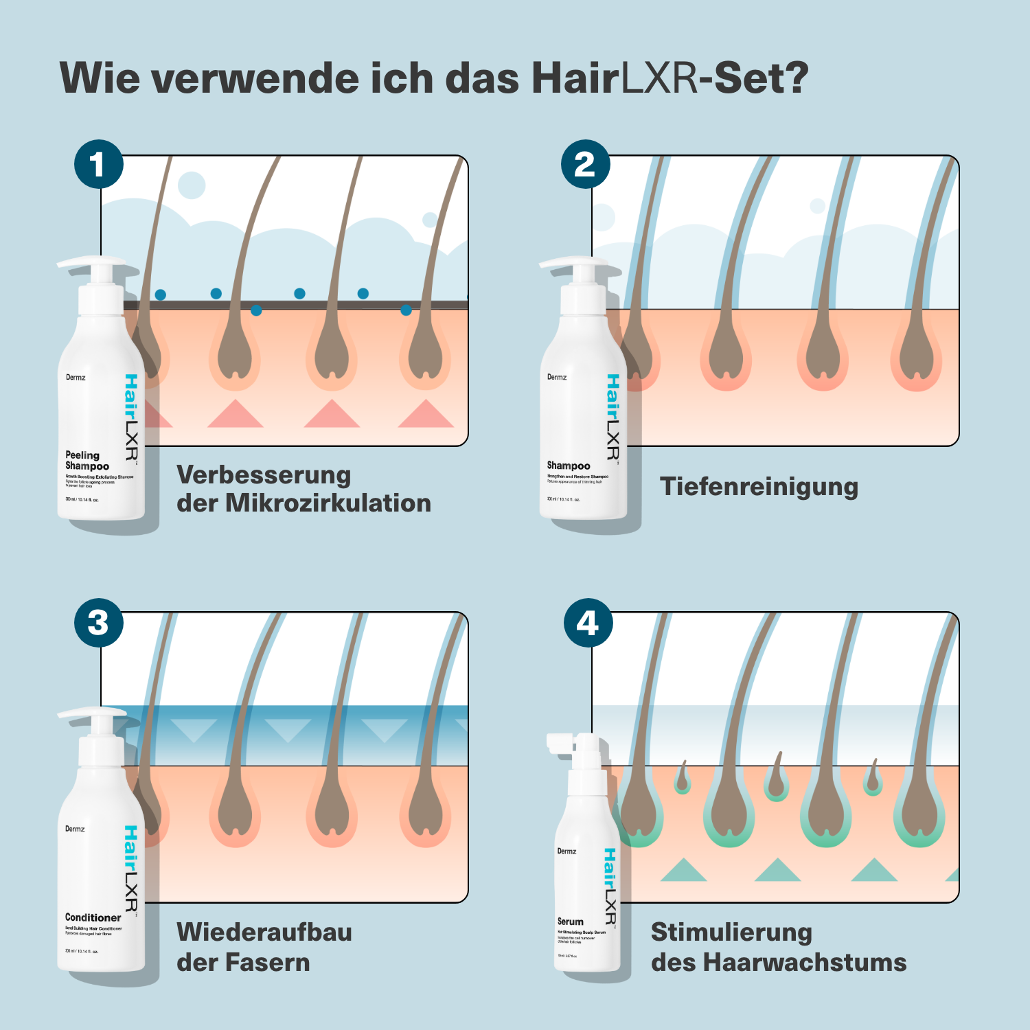 Revitalisieren Sie Ihr Haar mit dem 4-Stufen-Set von HairLXR, das dünner werdendem Haar, Haarausfall und Haarverlust vorbeugt und gleichzeitig kräftiges Wachstum und Vitalität fördert.