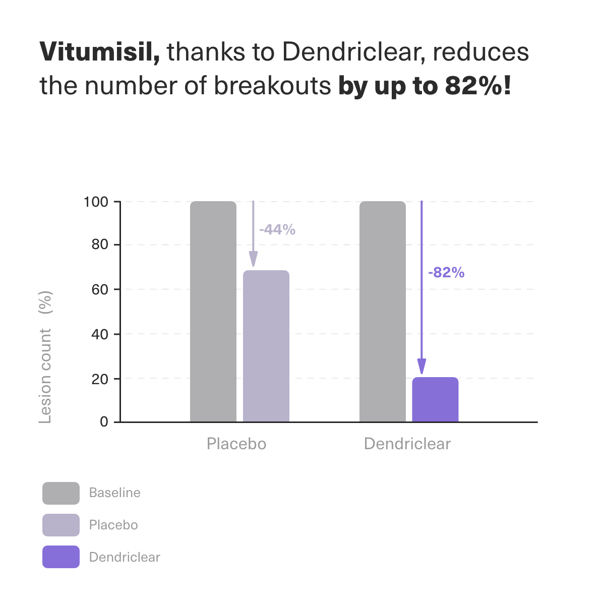 Clinical studies confirm that the patented active ingredient Dendriclear, found in Vitumisil products, effectively weakens acne-causing bacteria, preventing new breakouts and helping to reduce existing blemishes. Say goodbye to painful red spots and hello to smooth, healthy skin!